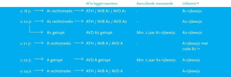* Wanneer een rijbewijs is behaald, worden ook de onderliggende rijbewijzen behaald. Voorbeeld: wanneer het A2-rijbewijs behaald is, mag ook op een A1-motor gereden worden.